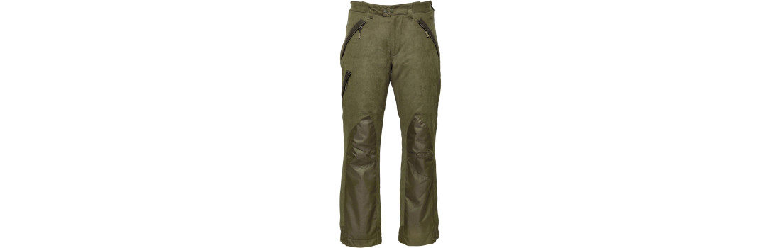 Штани виконані із високоміцного сумішного матеріалу, котрий практично не видає зайвого шуму, що особливо необхідно на полюванні. Місця, які більше всього піддаються зносу та стиранню - коліна і сідниці - додатково укріплені накладками із зносостійкого поліестеру. Стьобана підкладка, виготовлена з поліестеру, кріпиться до основного виробу за допомогою блискавок внизу штанин і на поясі.