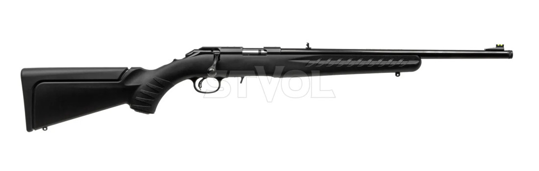 Холоднокований ствол довжиною 18″ (твіст 1:16) має різьбу 1/2-28 для встановлення саундмодератора або ДТК. Кут повороту руків’я затвора 60° забезпечує кліренс під оптичний приціл. Кнопка-фіксатор на коробці дозволяє знімати затвор без натискання на спуск — рідкісне рішення серед «болтівок». Базова комплектація містить регульований цілик і оптоволоконну мушку.