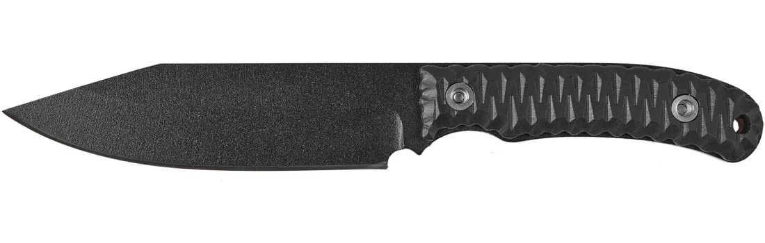 Клинок изготовлен из нержавеющей стали марки 1.4116 толщиной 5 мм, закалённой до твёрдости 57 HRC. Эта сталь легко правится в полевых условиях без специального инструмента. Клинок имеет профиль Drop Point, гладкую режущую кромку (plain edge), вогнутые спуски и чёрное полимерное антибликовое покрытие.