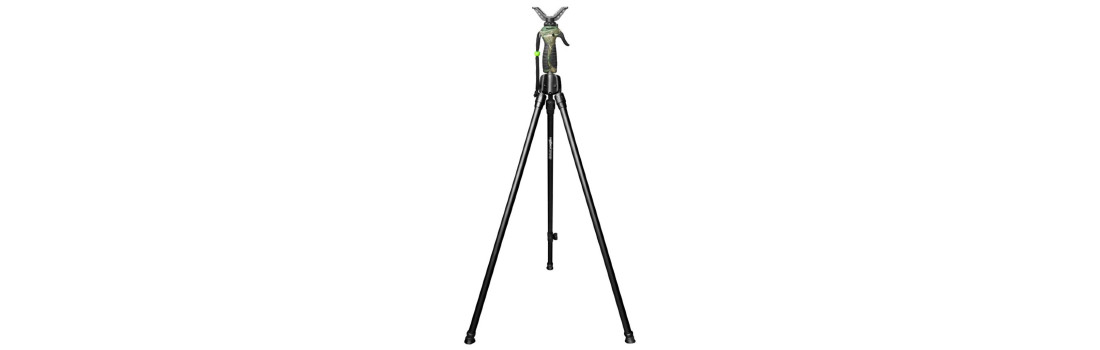 V-подібний акцент обертається на 360 градусів. Ребриста поверхня упору забезпечує безшумну викладку та захищає зброю від подряпин. Рукоятка, виготовлена із пластику з гумовими ставками, зручно лежить у руці та дозволяє регулювати висоту однією рукою. Опори-сошки виконані з міцного сплаву авіаційного алюмінію, а гумові п'яти, що регулюються, на нижній частині дозволять стійко розташувати трипод на різних поверхнях і захистять від ковзання на них.